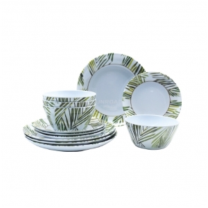 È composto da 12 pezzi: 4 piatti piani (diametro 25 cm), 4 piatti